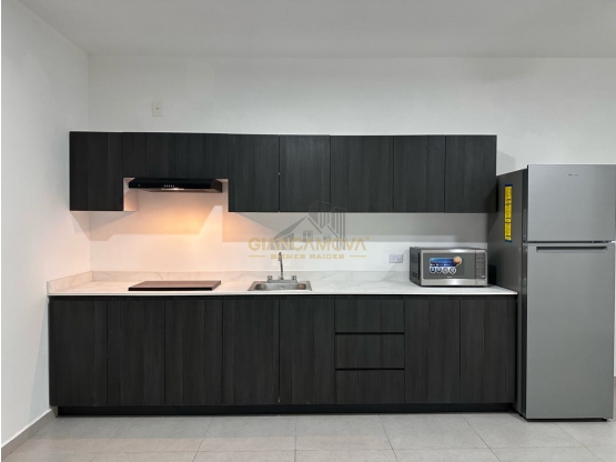 • Cocina integral con parrilla de inducción, campana, microondas y refrigerador
